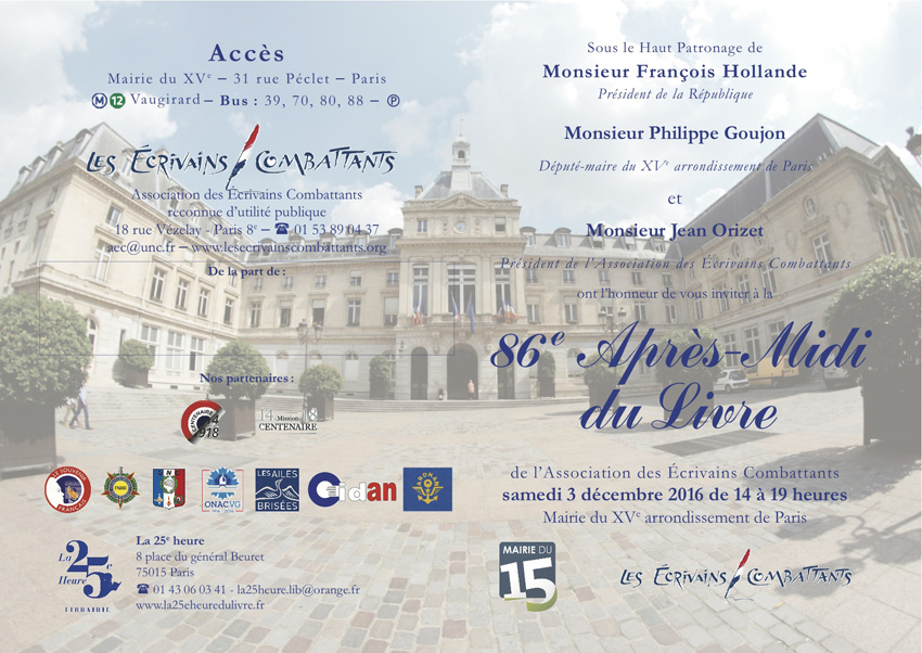 86e Après-midi du livre de l'Association des Ecrivains Combattants de 14 à 19 heures à la Mairie du XVe arrondissement de Paris.