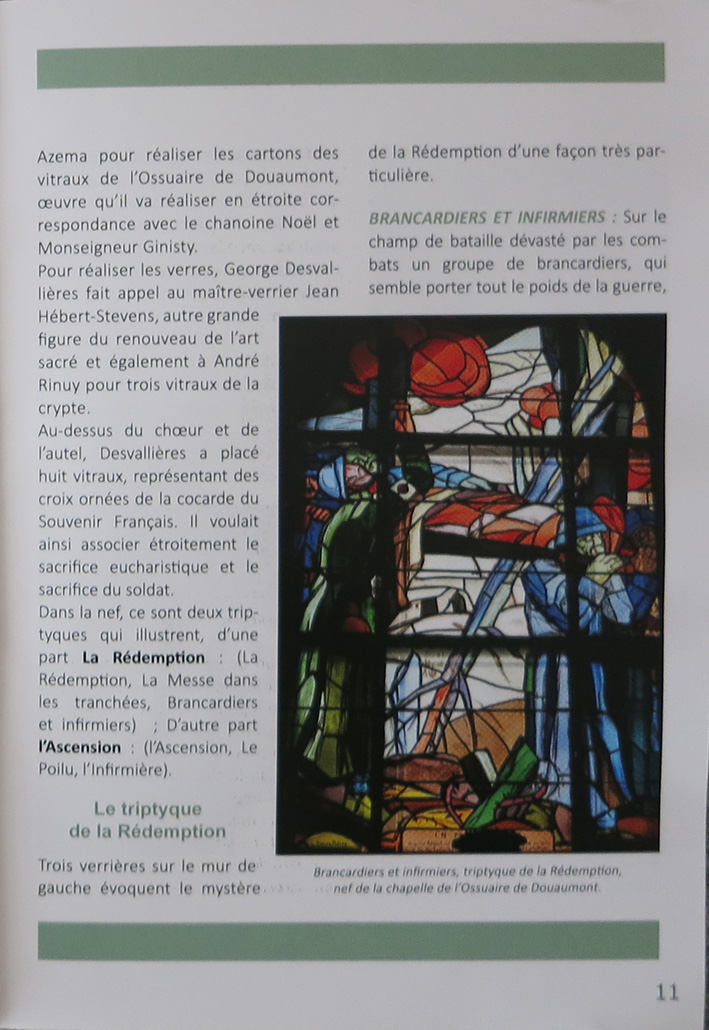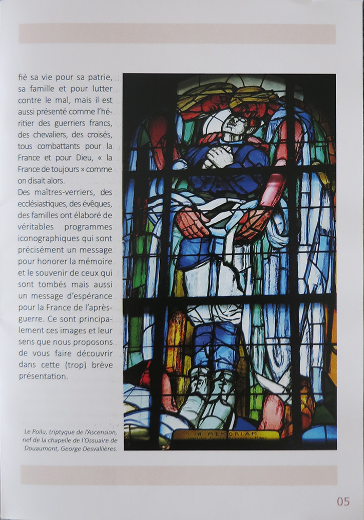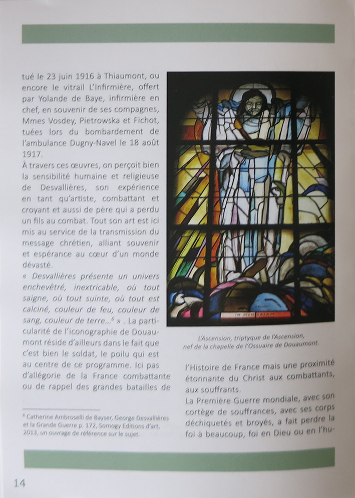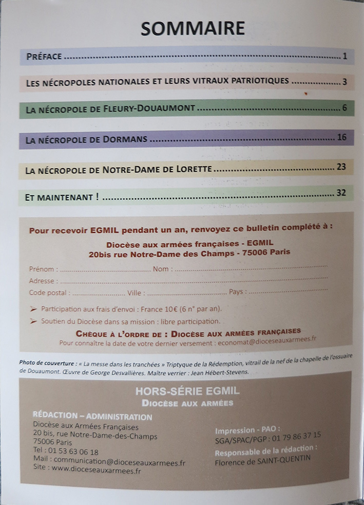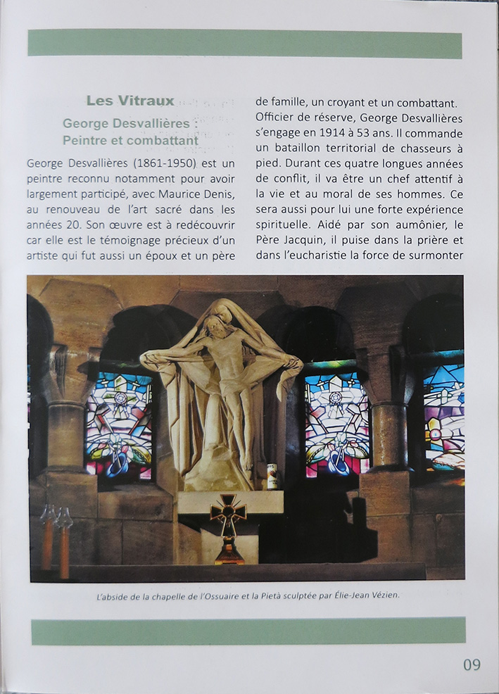 Pour cloturer l'année du centenaire de la Grande Guerre, le père Jean-Jacques Danel, aumônier militaire et historien d'art, a composé un numéro Hors-Série de l'EGMIL, Diocèse aux Armées intitulé « La Nécropole de Fleury-Douaumont, Les Vitraux, George Desvallières : peintre et combattant ». (1926-1927, CR 1833-1877)