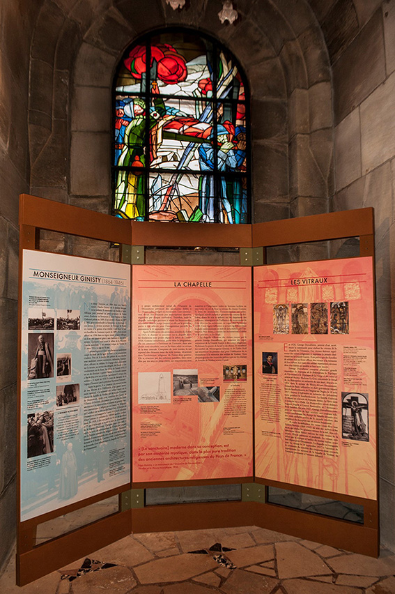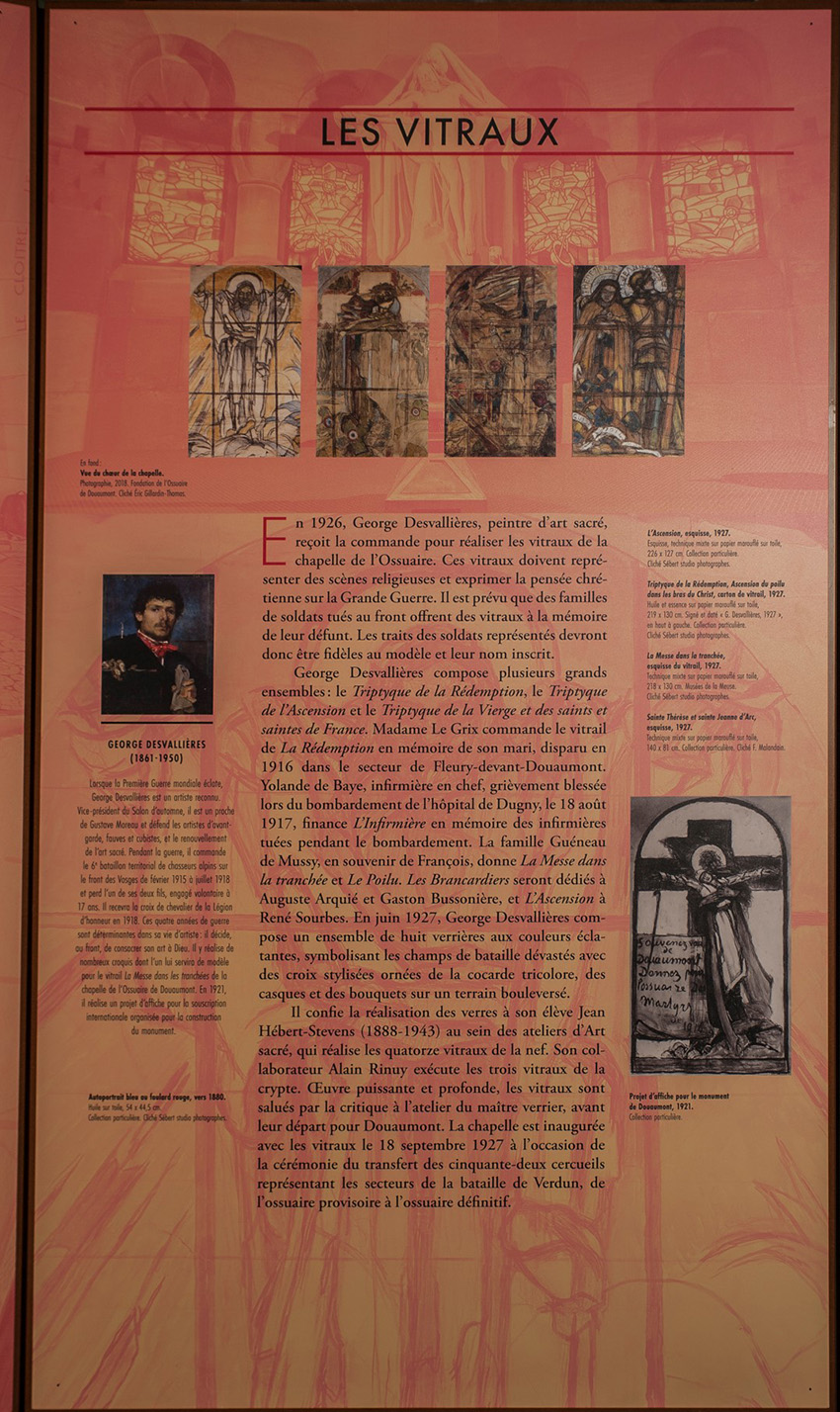 Les vitraux que George Desvallières a composés pour la chapelle de l'Ossuaire de Douaumont seront évoqués lors de cette exposition-dossier et donneront une fois de plus une idée de l'œuvre unique du peintre apôtre, témoin de ce conflit sanglant. Chaque verrière rappelle le sacrifice des hommes et des femmes engagés dans la guerre et leur ressemblance avec celui du Christ.