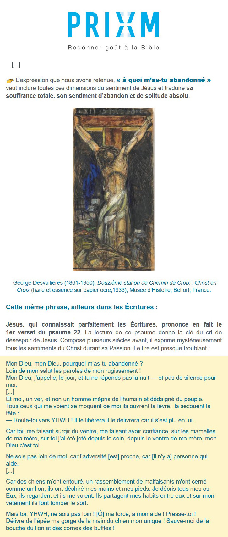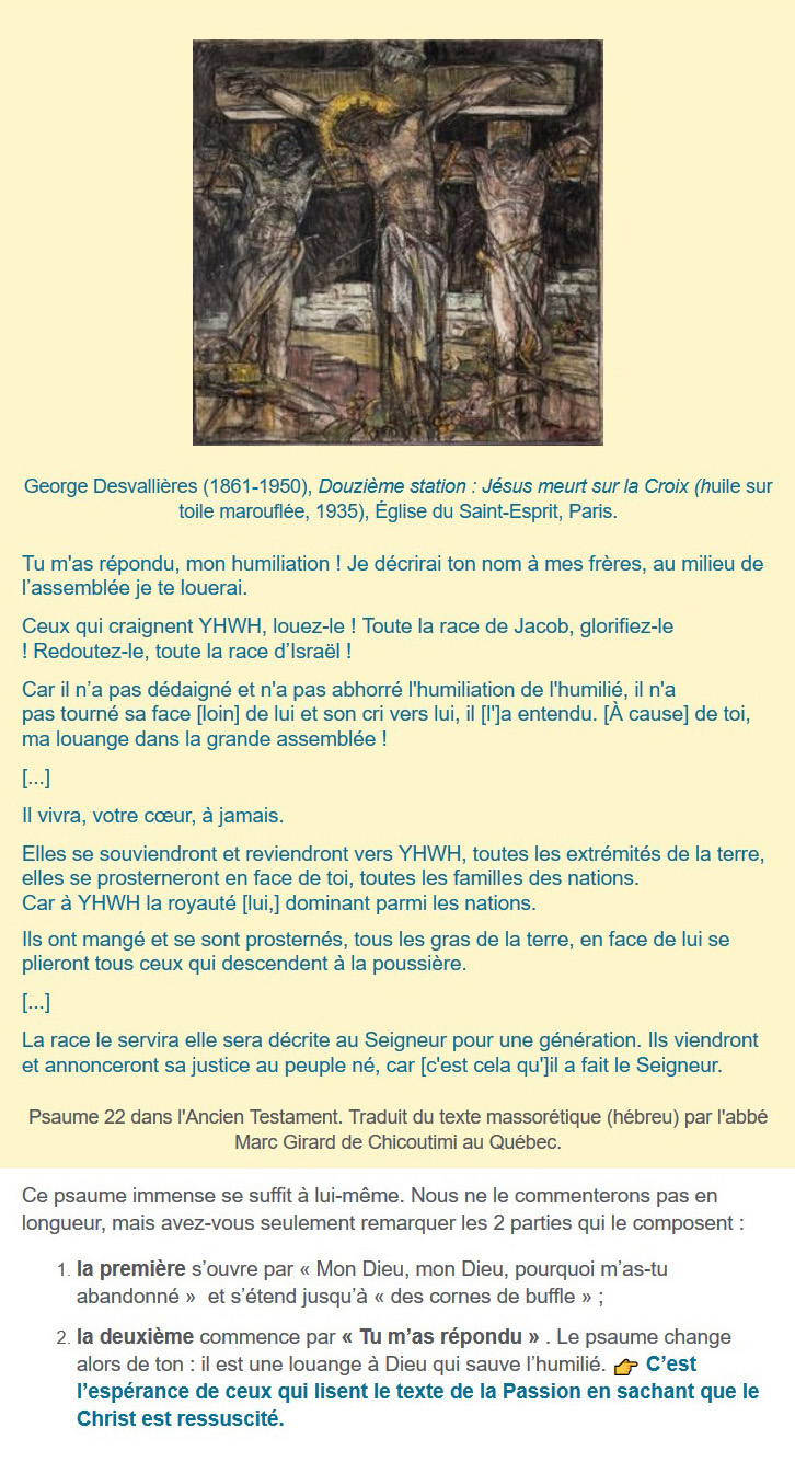 Cette semaine, les reproductions de deux œuvres de George Desvallières accompagnent le commentaire du Psaume 22 (CR 2147 et CR 2344). Voici l'extrait ci-dessous :