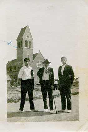 |  George Desvallières, entouré de Gérard Ambroselli et Pierre Isorni devant l'église Sainte-Barbe, à Wittenheim, 1929.